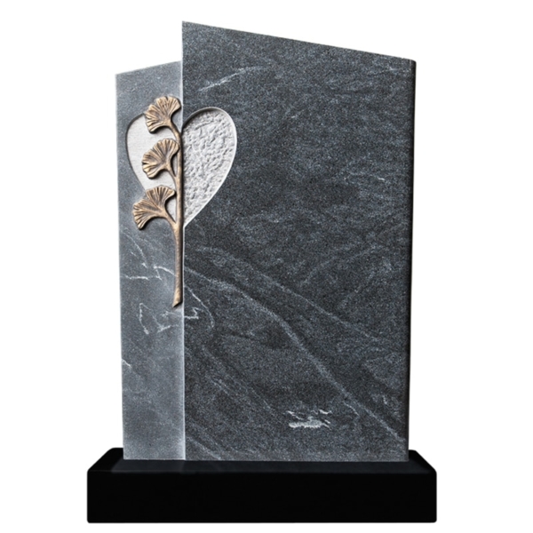 Einzelgrabstein poliert / satiniert, Herz & Ginkgoblätter patiniert