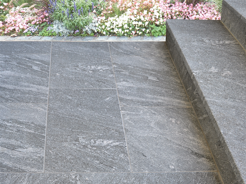 Nero Santiago ist ein ganz besonderer Granit, der sich durch seine wellenförmige Struktur hervorragend für Terrassen, Stufen, Poolumrandungen und Mauerabdeckungen eignet. Die weißen Quarzbänder fügen sich wunderschön in die hell- bis dunkelgraue Farbmischung ein. Gerade im nassen Zustand bringt Nero Santiago seine gesamte Farbvielfalt zur Geltung.